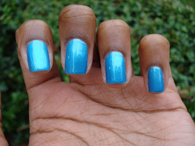 I can't begin to explain to you how hard it is to capture the true color of this polish. I tried indoor and outdoor. This is the best out of 20 pictures I took. The brush holds A LOT of polish, so you will have to be careful about that. This could have been a 1 coater if the first coat didn't have such bad streaks. This is 2 coats (I messed up on the middle finger) which turned out good, but it needs a patient hand to paint with. I didn't have that, so I will try this again at a later date.