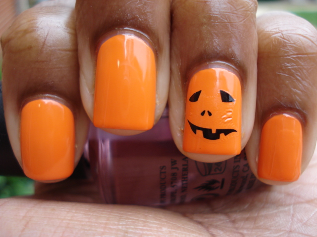 Good Morning Babes! Today I have OPI He's My Boo for today's mani. Yesterday was just a horrible swatch session, so I threw this on because I couldn't get it right. I will definitely have to make up for that today. He's My Boo is from the Spookettes mini collection, its your regular standard orange tone. This polish is a cream but the formula is very streaky and didn't even out until 3 coats. Dry time was ok but not the best, however it dried to a very glossy finish. I used a pumpkin water decal that came in the set, Nubar 2010 (this polish is thick, try very thin coats) just to see how it would look, Seche, and then I mattified it. It was very thick because I did a lot but I said I would post whether I like it or not because I'm learning as I go, so here's how it came out...