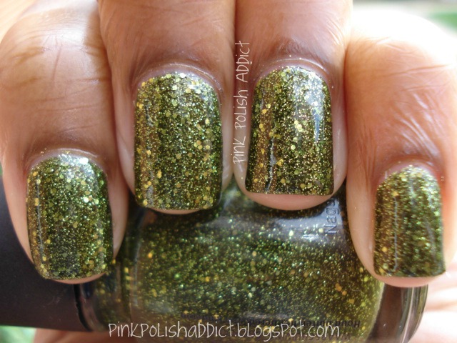 Good Morning Babes! It's Alive is one the polishes from China Glazes 2011 Halloween Collection, the star of the collection in my opinion. The base is a sheer shimmery muddy grass green with small and big green glitter in it. To reach opacity I needed 2 coats and the formula was no problem at all for it to be so jammed packed with glitter. I would recommend a little wait in between coats to prevent dragging, and 2 coats of SV (or a thick top coat) because it dries gritty and rough (I used 1 for the swatches but should have used 2 because it was still a little gritty).